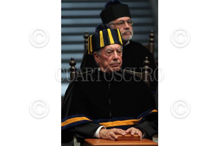 El escritor Mario Vargas Llosa escucha la charla “Pensar el Periodismo”, en el Paraninfo Enrique Díaz de León, durante el Foro “Los Desafíos de la Libertad de Expresión, Hoy.”