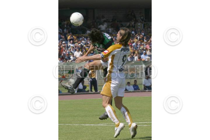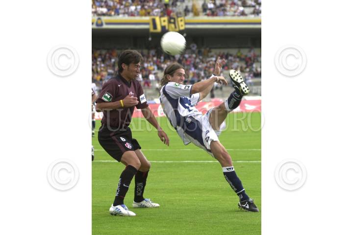 MEXICO, D.F. 06MARZO2005.- Juan Carlos Valenzuela (Atlas), disputó un balón con Bruno Marioni (Pumas) donde los pumas de la UNAM vencieron 3 goles a 2 a Atlas en el partido de la jornada 8 del torneo de clausura 2005 diputado en el estadio de Ciudad Universitaria. FOTO: Iván Stephens/CUARTOSCURO.COM
