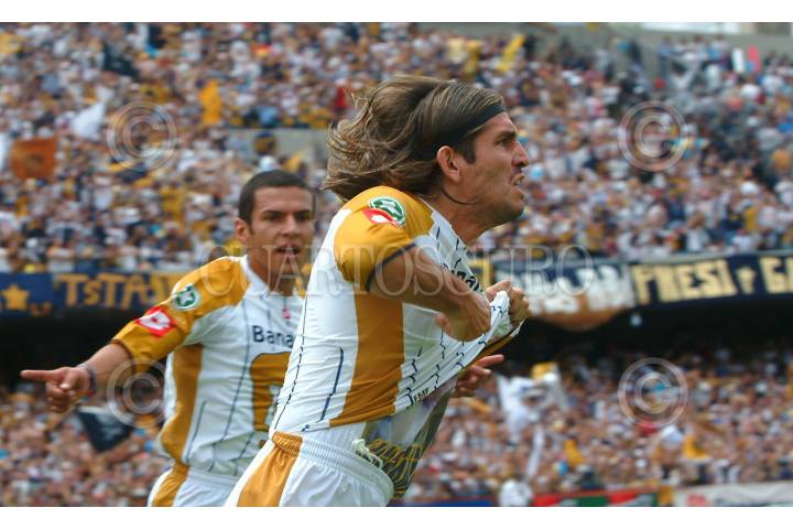 MEXICO, D.F. 07AGOSTO2005.- Bruno Marioni festeja el gol que le dio la ventaja y victoria a los Pumas de la UNAM de un gol a cero ante las Chivas Rayadas del Guadalajara en la continuación de la jornada 2 del torneo de apertura 2005 del fútbol mexicano. Gonzalo Pineda observa el festejo del delantero argentino. FOTO: Iván Stephens/CUARTOSCURO.COM