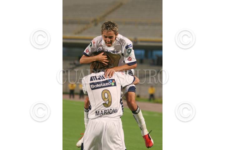 MÉXICO D.F. 08MARZO2006.- Josè Luis "parejita" Lòpez, festejó con el delantero de Pumas Bruno Marioni, el primer gol de el equipo universitario ante el equipo brasileiro, Internacional, en la cancha del Estadio Olimpico de Ciudad Universitaria. FOTO: Diego Gallegos/CUARTOSCURO.COM