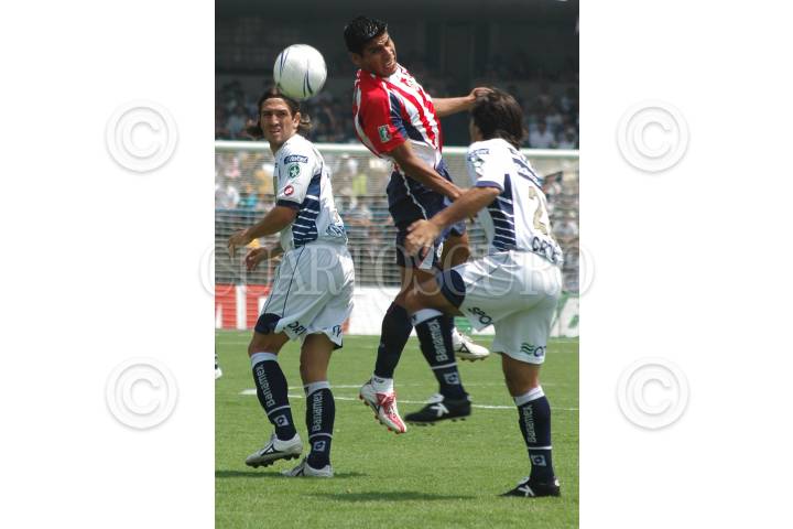 MEXICO, D.F. 07AGOSTO2005.- Bruno Marioni, (Pumas), disputa un balón con Carlos Arnoldo Salcido, mientras Martín Cardetti (Pumas) observa la acción en el partido de la jornada 2 del torneo de apertura 2005 en el que las Chivas rayadas del Guadalajara cayeron un por por cero ante los Pumas de la UNAM en el estadio de Ciudad Universitaria. FOTO: Iván Stephens/CUARTOSCURO.COM