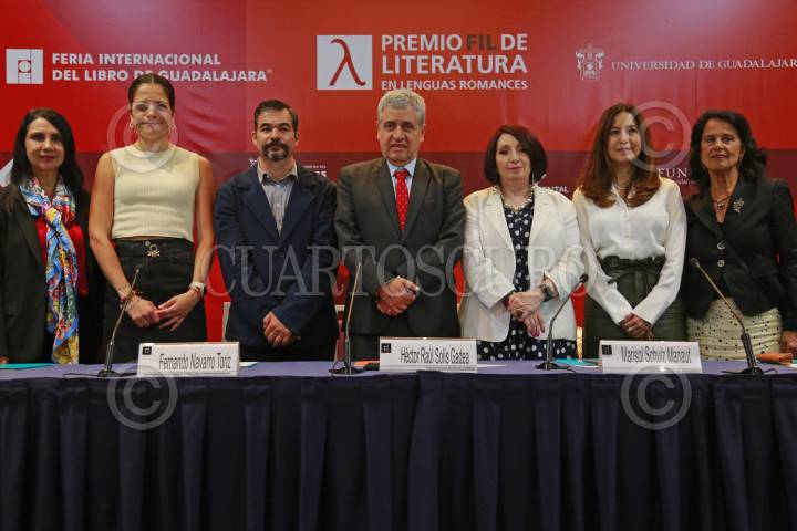 GUADALAJARA, JALISCO. 02SEPTIEMBRE2024.- Izq.-Der, Carlos Reis Catedrático en la Universidad de Coímbra (Portugal) y miembro del Jurado del Premio FIL de Literatura en Lenguas Romances, Héctor Raúl Solís Vicerrector Ejecutivo de la UdeG., Ricardo Villanueva Rector General de la Universidad de Guadalajara, Marisol Schulz Manaut Directora General de la FIL, Enrique Ibarra Secretario General de Gobierno y Dulce María Zúñiga Coordinadora Académica de la UdeG., encabezaron la conferencia de prensa donde dieron a conocer como ganador del Premio FIL de Literatura en Lenguas Romances al escritor Mozambiqueño Mia Couto. FOTO: FERNANDO CARRANZA GARCIA / CUARTOSCURO.COM
