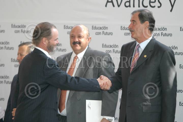 MÉXICO, DF, 30 ENERO 2006.- Mark Hagerstrom, gerente del sector social y departamento de Colombia y México del Banco Mundial, Reyes Tamez Guerra, Secretario de Educación Pública y el presidente, Vicente Fox durante la ceremonia del programa “Nueva escuela pública. Programa de Escuelas de Calidad. Avances y perspectivas”, que se llevo acabo en la escuela primaria "Antonio Semionovich Makarenko". FOTO: Leonardo Casas/CUARTOSCURO.COM