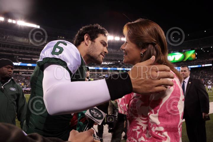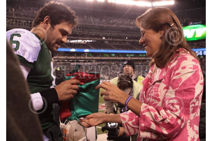 NUEVA YORK, ESTADOS UNIDOS, 26NOVIEMBRE2010.- Margarita Zavala, esposa del presidente Felipe Calderón, fue la encargada de realizar el volado previo al arranque del encuentro entre Los Jets de Nueva York y Los Bengalíes de Cincinnati, después del volado entregó una bandera de México a Mark Sánchez, mariscal de campo de los Jets de Nueva York. FOTO: CUARTOSCURO.COM