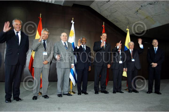 MEXICO, D.F.08SEPTIEMBRE2004.- Vicente Fox Quesada, presidente de la República y Kofi Annan, secretario general de la ONU, estuvieron presentes en la inauguración del seminario internacional Democracia, Política y Estado. En la imagen, se tomaron la foto del recuerdo con Mark Malloch-Brown, administrador de la UPDN, Felipe González, ex-presidente de España, Julio María Sanguinetti, ex-presidente de Uruguay, Valentín Paniagua, ex-presidente de Perú, Belisario Bentacourt, ex-presidente de Colombia y Luis Ernesto Derbez, secretario de Relaciones Exteriores. FOTO: Moisés Pablo/CUARTOSCURO.COM