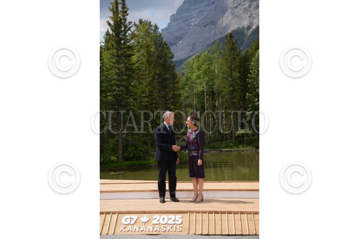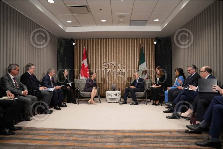 ALBERTA, CANADÁ, 17JUNIO2025.- Mark Carney, Primer Ministro de Canadá, entabló una conversación con Claudia Sheinbaum Pardo, Presidenta de México, al tomarse la foto oficial del G7, que se celebró en la región de Kananaskis. Ahí destacó el llamado a una cooperación entre ambas naciones. FOTO: PRESIDENCIA/CUARTOSCURO.COM