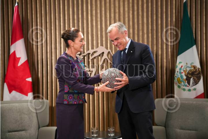ALBERTA, CANADÁ, 17JUNIO2025.– Claudia Sheinbaum Pardo, presidenta de México, entregó a Mark Carney, primer ministro de Canadá, un balón conmemorativo de la Copa Mundial de Fútbol 2026, elaborado por artesanos wixárika, al concluir su participación en la Cumbre del G7. FOTO: PRESIDENCIA/CUARTOSCURO.COM