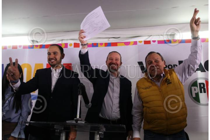 CIUDAD DE MÉXICO, 15FEBRERO2024.- Marko Cortés Mendoza, presidente del PAN; Santiago Taboada Cortina, candidato a jefatura de Gobierno Coalición Va x la CDMX; José de Jesús Zambrano Grijalva, presidente del PRD durante el registro de Santiago Taboada como candidato a la jefatura de Gobierno de la Ciudad. FOTO: ANDREA MURCIA /CUARTOSCURO.COM