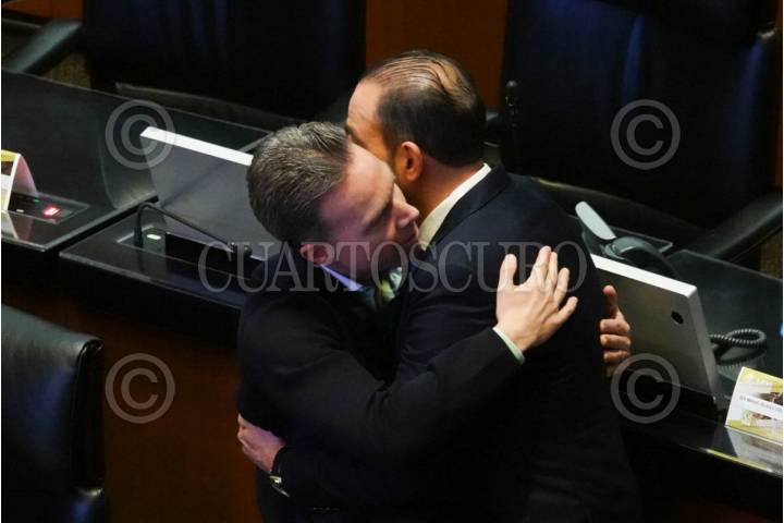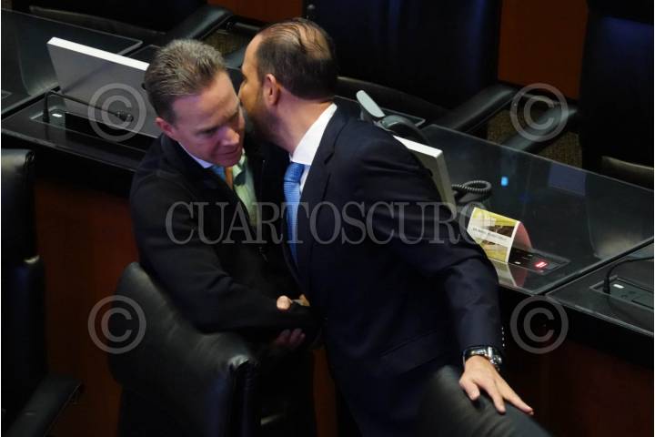 CIUDAD DE MÉXICO, 12NOVIEMBRE2024.- Marko Cortés y Gustavo Sánchez, durante la sesión ordinaria de la Cámara de Senadores en donde se prevé que se discuta, se vote y se tome la protesta de la nueva titular de la Comisión Nacional de los Derechos Humanos. FOTO: ROGELIO MORALES /CUARTOSCURO.COM