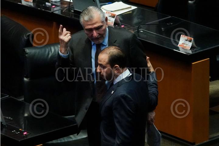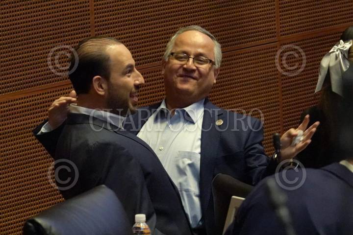 CIUDAD DE MÉXICO, 28NOVIEMBRE2024.- Adán Augusto López, coordinador de la bancada morenista, y el senador panista Marko Cortés se saludaron durante la sesión ordinaria del Senado de la República en que se ratificó a Raquel Buenrostro como secretaria de la Función Pública y posteriormente la discusión sobre la eliminación de Órganos Autónomos. FOTO: GALO CAÑAS/CUARTOSCURO.COM