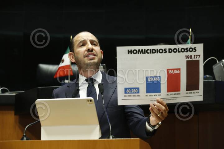 CIUDAD DE MÉXICO, 25SEPTIEMBRE2024.- La bancada panista mostró su rechazo a la ley que reintegra a la Guardia Nacional al mando de la Sedena, ya que ellos señalan que esto es militarizar la seguridad del.pais, además de que no se ha resuelto el problema del combate a la violencia, esto durante la sesión en la que se aprobó está disposición. En la imagen Marko Cortés muestra la cifras de homicidios dolosos en los últimos cuatro sexenios y destaca que en la época de Morena estos han subido considerablemente. FOTO: CUARTOSCURO.COM