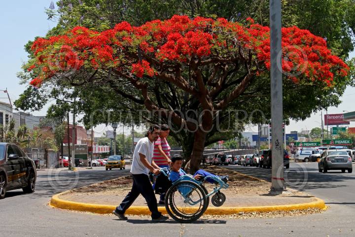 GUADALAJARA, JALISCO, 03MAYO2016.- Tres personas, entre ellos un niño con capacidades diferentes, caminan por la calle Marsella cruzando la Avenida Niños Héroes, al fondo un árbol Framboyán o mejor conocido como Tabachin. FOTO : FERNANDO CARRANZA GARCIA / CUARTOSCURO.COM