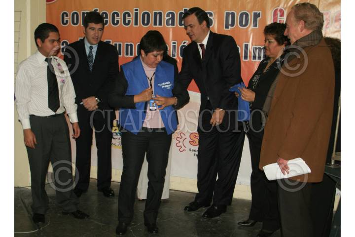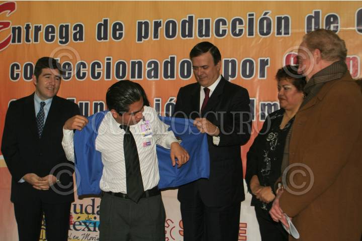 MÉXICO, D.F., 02FEBRERO2010.- Marcelo Ebrard Casaubon, Jefe de Gobierno Capitalino, asistió a la entrega de Chalecos por trabajadores de Walt Mart de México en las instalaciones del Cooperativo de Costura "Quetzal", dicho evento es parte del programa de empleos que implementa la ciudad para fortalecer el crecimiento económico. FOTO: ENRIQUE ORDÓÑEZ/CUARTOSCURO.COM
