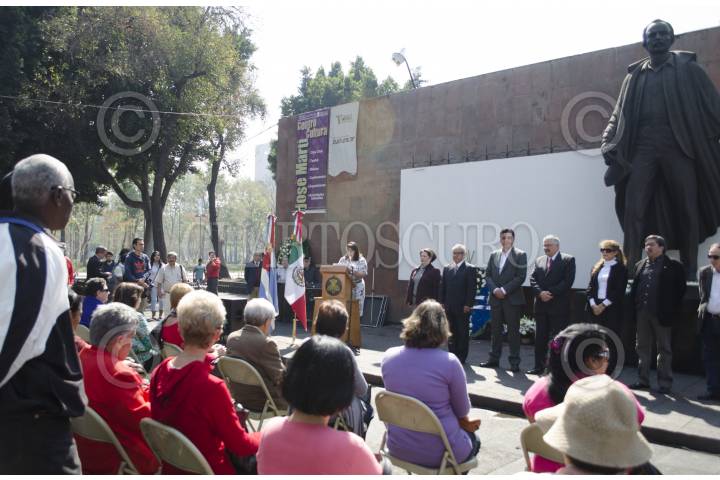 MÉXICO, D.F., 28ENERO2013.- El Centro Cultural José Martí conmemoró el 160 aniversario del natalicio del pensador, político, periodista, filósofo y poeta cubano, de origen español, José Martí Pérez. Con una ceremonia a la cual asistió el embajador de Cuba, Dagoberto Rodríguez Barrera, y la inauguración de una exposición pictórica de artistas cubanos, se recordó al creador del Partido Revolucionario Cubano(1892). FOTO: SANDRA PÉREZ /CUARTOSCURO.COM