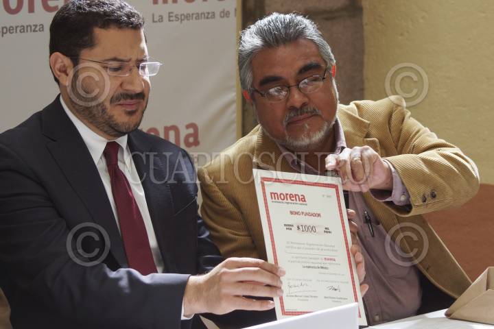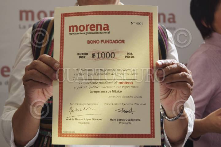 MÉXICO, D.F., 09ENERO2013.- Fue inaugurada la sede del Comité Ejecutivo Nacional del Movimiento de Regeneración Nacional (MORENA), en la calle de Santa Anita de la colonia Viaducto Piedad. Además, en conferencia de prensa presentaron el plan de financiamiento para el partido. En la imagen, el bono fundador que demuestra la donación que aportaría cada miembro del partido. FOTO: ADOLFO VALTIERRA /CUARTOSCURO.COM