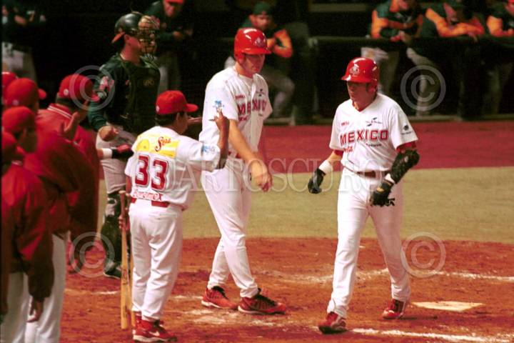 Kevin Griyak y Ray Martínez llegan a home para marcar la 5a y 6a carrera a favor de los Diablos de México ante los Leones de Yucatan. FOTO: David Bolaños/CUARTOSCURO.COM