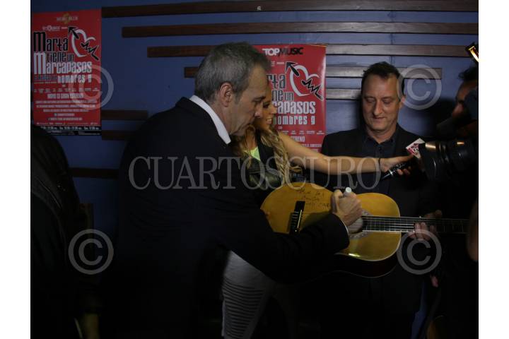 CIUDAD DE MÉXICO 13MAYO2016.- El cantante del grupo, español de rock los Hombres G, David Summers firmo una guitarra para los fans que asistieron al musical "Marta Tiene Un Marcapasos". FOTO: ANTONIO CRUZ/ CUARTOSCURO.COM