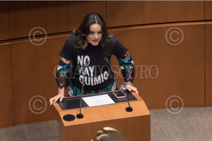 Martha Cecilia Márquez Alvarado, senadora panista, porto una playera con la leyenda "No hay quimios" y le pregunto a Olga Sánchez Cordero, presidenta de la mesa directiva del Senado de la República, si en este período se discutirá la problemática de la falta de quimios.
