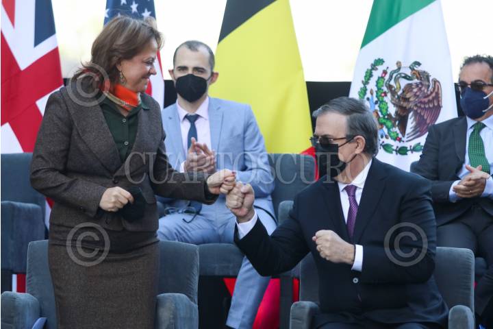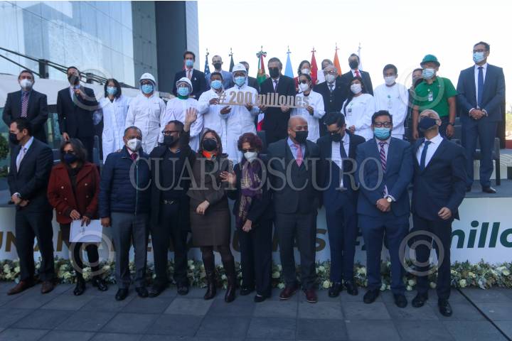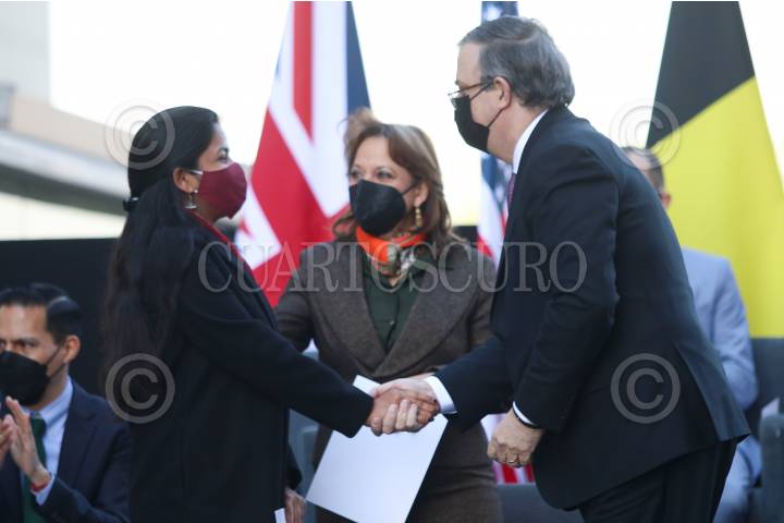 Marcelo Ebrard, secretario de Relaciones Exteriores, y Martha Delgado, subsecretaría de la Secretaría de Relaciones Exteriores, encabezaron "Un año de vacunas #200 millones", el cual se realizó en la terraza de la Secretaría de Relaciones Exteriores