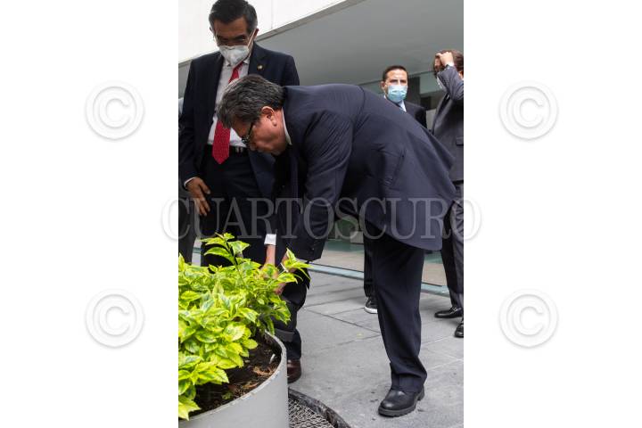 El senador Ricardo Monreal ata los cordones de sus zapatos en el patio del Senado.