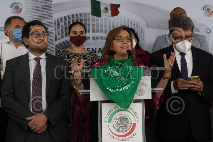 Los senadores de Morena César Cravioto, Ricardo Monreal y Martha Lucía Mícher durante la conferencia en la que celebraron la decisión de la SCJN de despenalizar el aborto.
