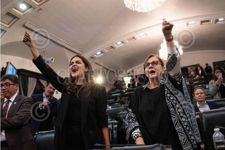 CIUDAD DE MÉXICO, 11SEPTIEMBRE2024.- Senadores de Morena festejan la aprobación de la Reforma del Poder Judicial en la Vieja Casona de Xicoténcatl. En la imagen las senadores Andrea Chávez y Martha Lucía Mícher celebran con el puño arriba la aprobación de estos cambios constitucionales. FOTO: CUARTOSCURO.COM