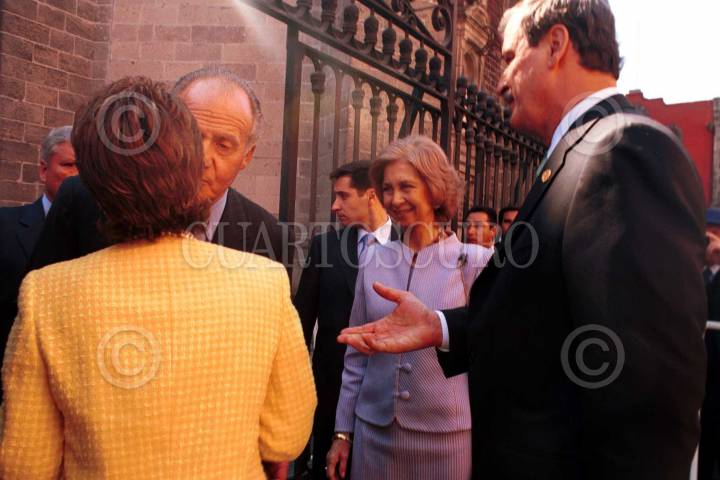 Los reyes Juan Carlos I y Sofía de España a la salida de la Catedral Metropolitana, en el Centro Histórico capitalino, se despiden del presidente Vicente Fox y su esposa Martha Sahagun. FOTO: Susana Navarrete/CUARTOSCURO.COM