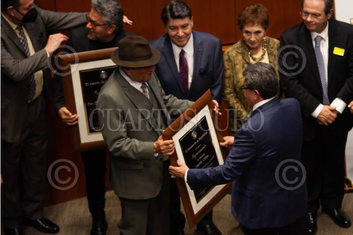 Martín Urieta, compositor y presidente de la Sociedad de Autores y Compositores de México, recibió un reconocimiento por parte del senador Ricardo Monreal durante el Homenaje al trabajo de grandes compositores mexicanos en el pleno del Senado de la República