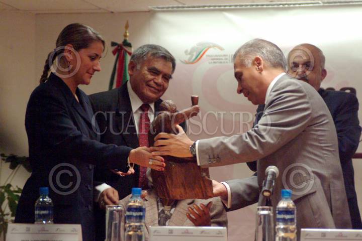 MEXICO, D. F. 26OCTUBRE2004.- Martiniano León Pesch le entregó a Rafael Macedo de la Concha, Procurador General de la República, un hombre de la tercera edad hecho de madera. FOTO: Iván Stephens/CUARTOSCURO.COM