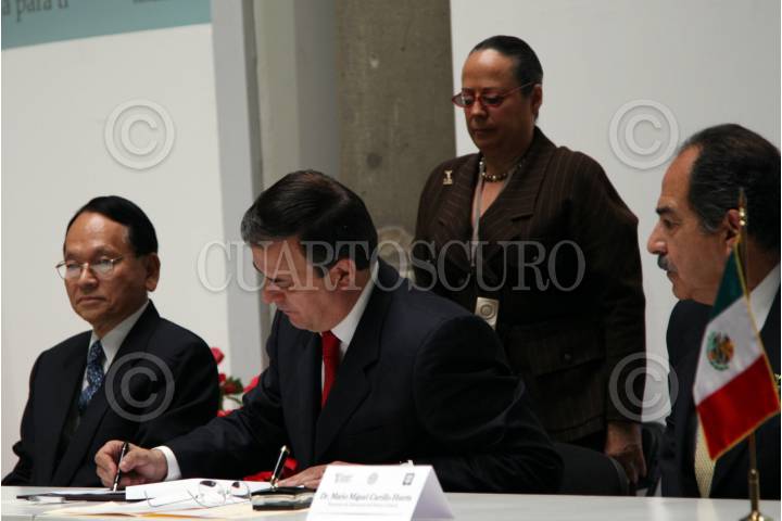 MÉXICO, D.F., 04DICIEMBRE2009.- Masaaki Ono, embajador de Japón en México, Marcelo Ebrard Casaubón, Jefe de Gobierno y Mario Carrillo Huerta, Secretari de Educación del DF, firmaron el Convenio de Donación entre la Embajada de Japón en México y la Secretaría de Educación del Gobierno del Distrito Federal para el proyecto de mejoramiento de condiciones sanitarias de 614 escuelas primarias de la Ciudad de México. FOTO: CUARTOSCURO.COM