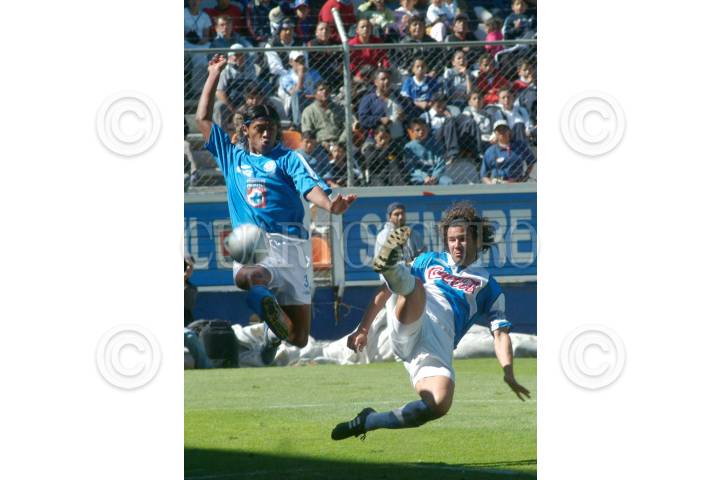 PACHUCA, HIDALGO 09ENERO2004.- Joel Huiqui (Cruz Azul) disputó un balón con Oscar Mascorro (Puebla) en el partido disputado en la ciudad torneo cuna de futbol en el que venció cruz azul a Puebla. FOTO: Iván Stephens/CUARTOSCURO.COM