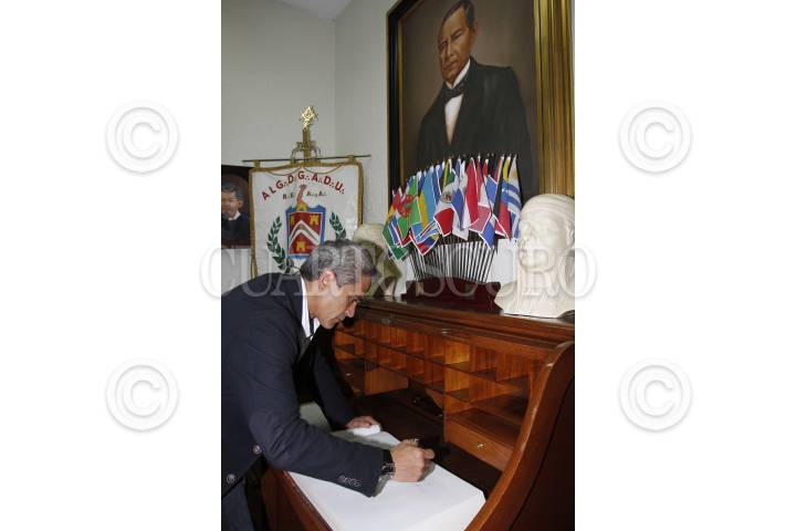 MÉXICO, D.F., 21MARZO2012.- Manuel Jiménez Guzmán, líder mason y exdiputado priísta, regaló a Miguel Ángel Mancera, precandidato del PRD a la jefatura de Gobierno del DF, el libro "Apuntes Para Mis Hijos " de Benito Juárez, en el marco de la conmemoración de su natalicio. Ahí, Jiménez Guzmán, estableció, que a nivel local los liberales apoyarán a Mancera, aún en contra de la priista Beatriz Paredes. FOTO: JUAN PABLO ZAMORA /CUARTOSCURO.COM