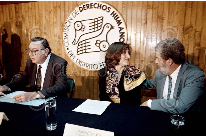 Consejeros de la Comisión de Derechos Humanos del Distrito Federal, en voz de Miguel Concha (izq), exhortaron una vez más a las autoridades judiciales para que dejen libre a Paola Durante, involucrada en el asesinato del conductor Paco Stanley. Angeles Mastretta y Nestor de Buen conversan
