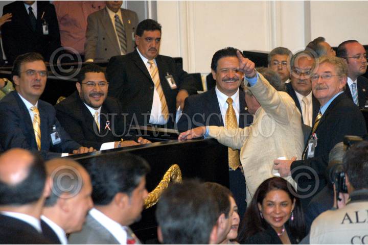 MÉXICO D.F. 17SEPTIEMBRE2006.- Marcelo Ebrad acompañado de Matí Batres presidente del PRD Carlos Navarrete cordinador de los Senadores del PRD y Jesús González Garza, cordinador de diputados del mismo partido, durante el ultimo informe de gobierno de Alejandro Encinas, en la asamblea de representantes. FOTO: GUILLERMO PEREA/CUARTOSCURO.COM
