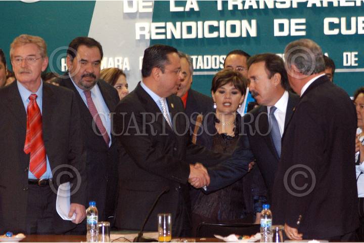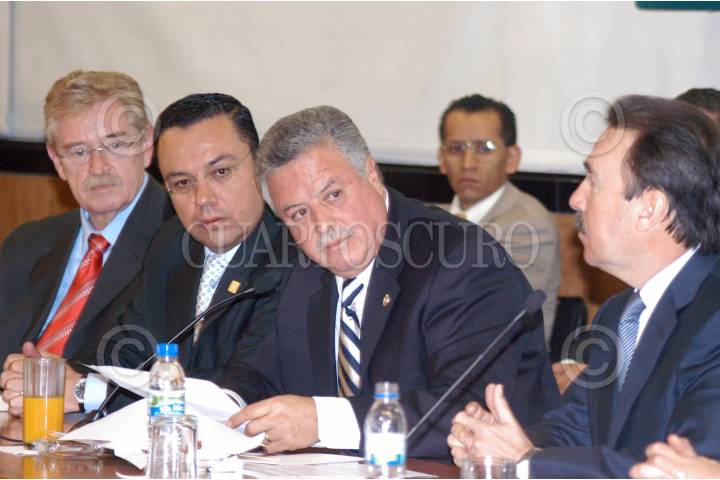 MÉXICO D.F. 27FEBRERO2007.- Los diputados, Javier González Garza del PRD, Germán Matínez Cazares secretario de la función pública, Jorge Zermeño presidente de la mesa directiva en la cámara de diputados y Emilio Gamboa Patrón del PRI, durante el pronunciamiento de controladores, esto en el Palacio Legislativo. FOTO: GUILLERMO PEREA/CUARTOSCURO.COM