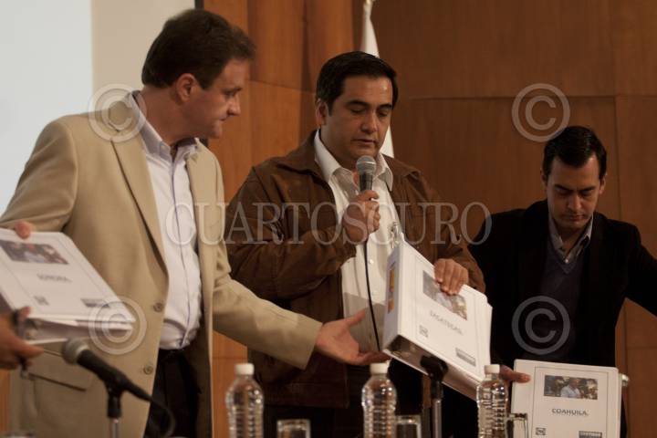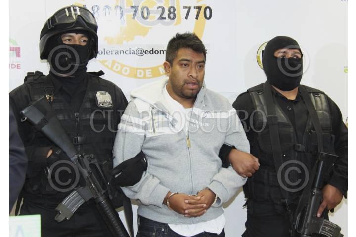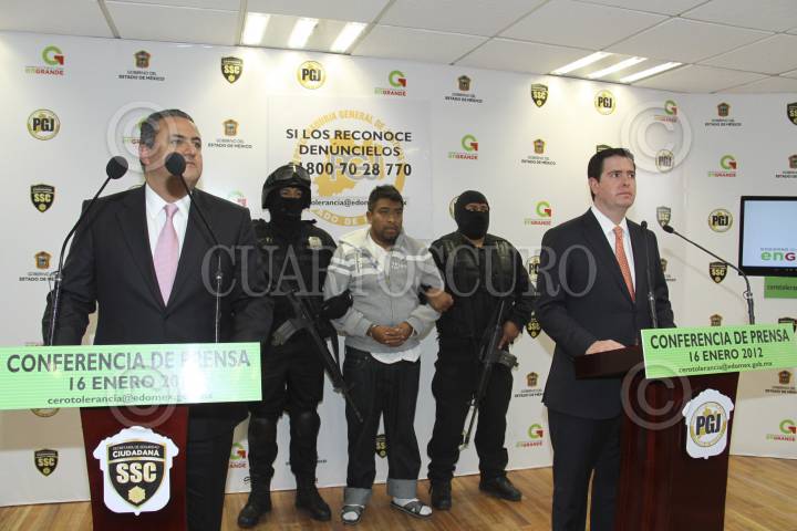 TOLUCA, ESTADO DE MÉXICO, 16ENERO2012.- Salvador Neme Sástre, Secretario de Seguridad Ciudadana y Alfredo Castillo Cervantes, titular de la Procuraduría mexiquense, presentaron ante los medios de comunicación a Raymundo Mateo Cruz, alias "El Mata", presunto líder del grupo delictivo La Familia Michoacana en el poniente del Estado de México. FOTO: CUARTOSCURO.COM