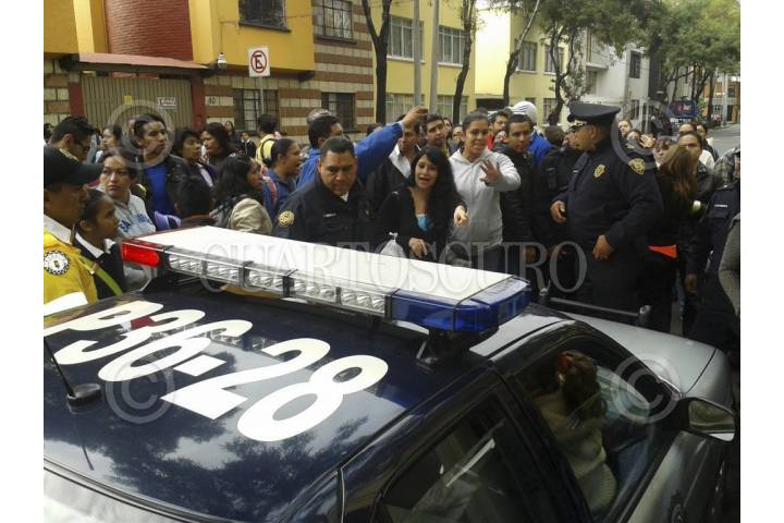 MÉXICO, D.F., 20AGOSTO2014.- Padres de familia de la escuela primaria José María Mata bloquearon la circulación de la vialidad a la altura de Obrero Mundial debido a que acusaron a un niño de acosar a sus compañeros del plantel ubicado en la calle de Amores en la delegación Benito Juárez. Durante la manifestación, la madre del niño señalado de realizar bullyng, fue acosada por lo que se tuvo que resguardar a la mujer y a su hijo en una patrulla entre gritos y reclamos de los demás padres de familia. FOTO: ESPECIAL /CUARTOSCURO.COM