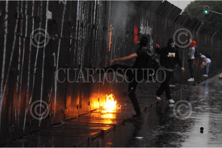 CIUDAD DE MÉXICO, 02OCTUBRE2023. - Grupos de anarquistas golpean las vallas que fueron colocados para proteger Palacio Nacional durante la marcha por el 55 aniversario de la matanza de Tlatelolco. FOTO: DANIEL AUGUSTO /CUARTOSCURO.COM