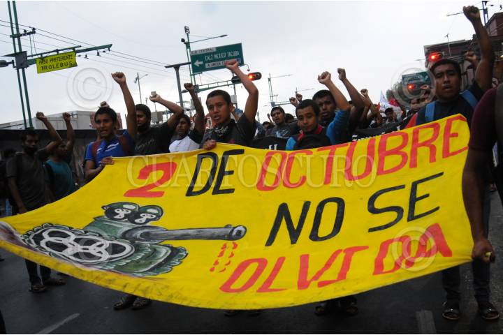 CIUDAD DE MÉXICO, 02OCTUBRE2023. - La marcha por el 55 aniversario de la matanza de Tlatelolco avanzó por Eje Central rumbo al Zócalo. FOTO: DANIEL AUGUSTO /CUARTOSCURO.COM