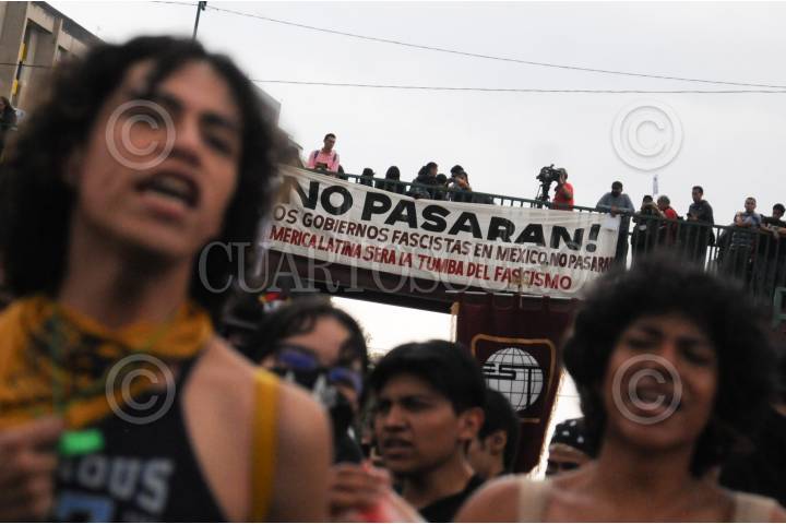CIUDAD DE MÉXICO, 02OCTUBRE2023. - Grupos de anarquistas pintaron en su camino la leyenda "Harfuch Genocida", esto durante la marcha por el 55 aniversario de la matanza de Tlatelolco. FOTO: DANIEL AUGUSTO /CUARTOSCURO.COM