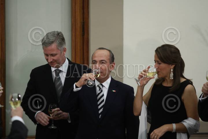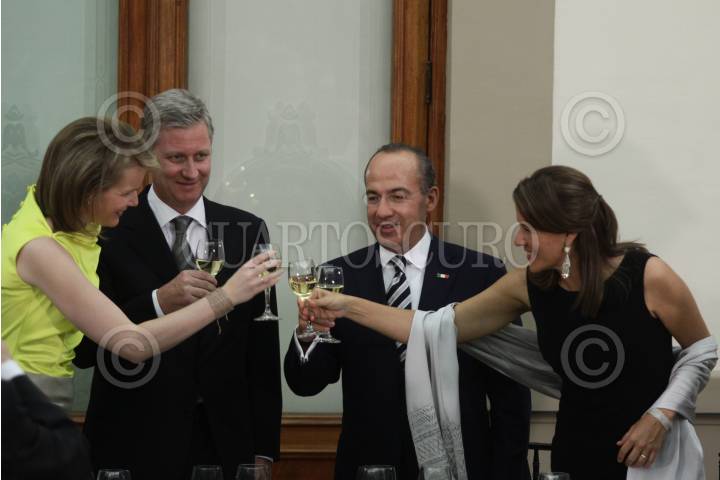 MÉXICO D.F., 23MARZO2009.- Felipe Calderón Hinojosa acompañado po su esposa Margarita Zavala brindan con los principes de Bélgica Phillipe y Mathilde durante la cena que el mandatario mexicano ofreció en su honor con motivo de su visita. FOTO: SÁSHENKA GUTIERREZ/CUARTOSCURO.COM