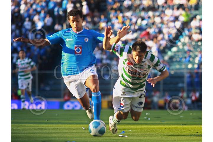 MÉXICO, D.F., 06FEBRERO2010.- Luis Landín disputa el balon con Vicente Matias durante el partido correspondiente de la jornada cuatro del Torneo Bicentenario 2010, entre La Máquina Cementera y el Santos Laguna, quedando un marcador final de 2-0 favor Santos. FOTO: SÁSHENKA GUTIÉRREZ/CUARTOSCURO.COM