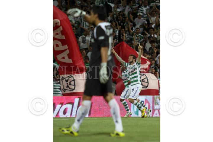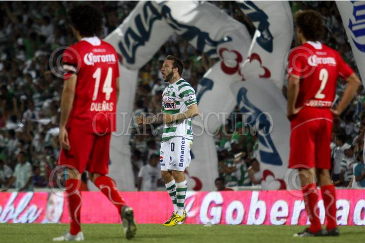 TORREON, COAHUILA, 20MAYO2010.- Vicente Matías Vuoso de los guerreros del Santos Laguna festeja su anotación en contra de los Diablos del Toluca en el partido de ida de la final del torneo Bicentenario del fútbol mexicano que se realiza en el estadio Corona, quedando empatado a dos goles. FOTO: RODOLFO ANGULO/CUARTOSCURO.COM