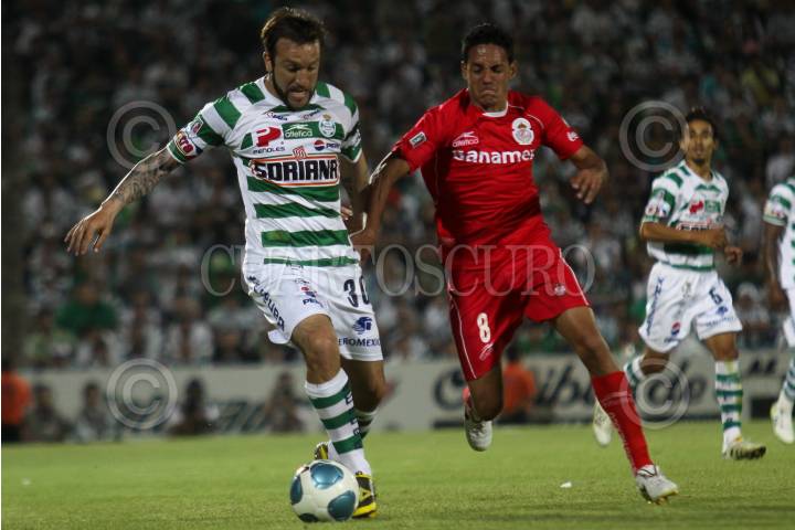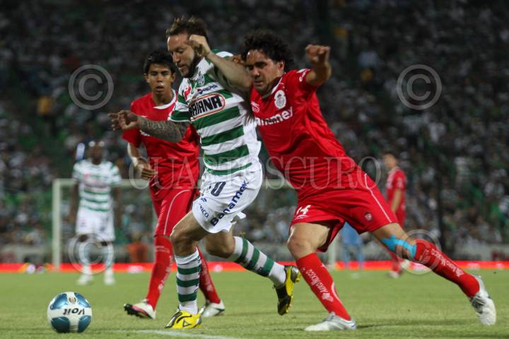 TORREON, COAHUILA, 20MAYO2010.- Vicente Matías Vuoso de los guerreros del Santos Laguna pelea el balón durante el encuentro en contra de los Diablos del Toluca en el partido de ida de la final del torneo Bicentenario del fútbol mexicano que se realizó en el estadio Corona, quedando empatado a dos goles. FOTO: RODOLFO ANGULO/CUARTOSCURO.COM