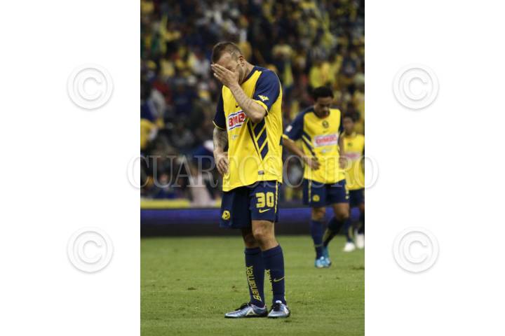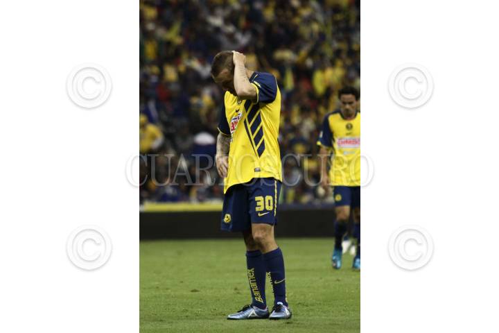 MÉXICO, D.F., 25NOVIEMBRE2010.- Vicente Matias Vouso de las Águilas del América se lamenta al termino del partido en contra del Santos Laguna del encuentro de ida de las semifinales del torneo Apertura 2010 que se realizo en el estadio Azteca. Santos Laguna venció a las Águilas 2 goles por 1. FOTO: RODOLFO ANGULO/CUARTOSCURO.COM