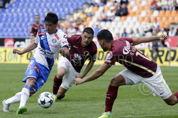 PUEBLA, PUEBLA, 21AGOSTO2016.- Los jugadores Matías Alustiza y Pablo Aguilar disputan el balón durante el partido entre el los Clubes Puebla y América correspondiente a la jornada 6 del torneo de apertura 2016 celebrado en el estadio Cuahutémoc. FOTO: HILDA RÍOS /CUARTOSCURO.COM