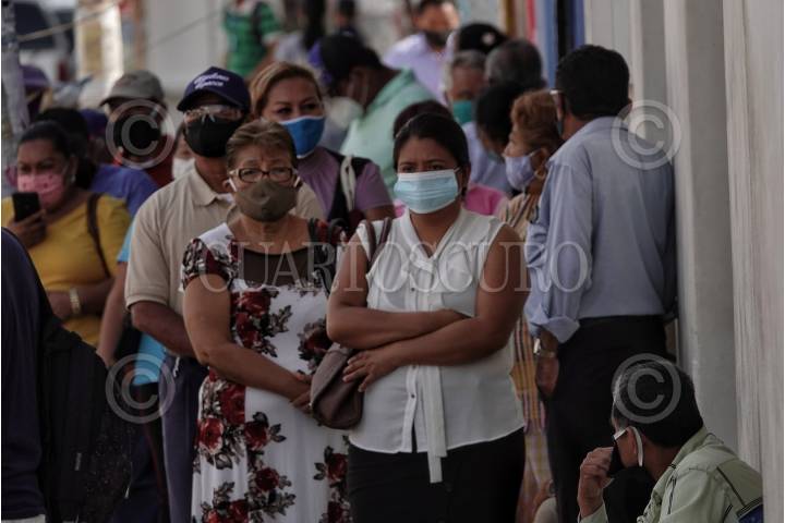Personas esperan para poder ingresar al banco ubicado en la plaza central de Matías Romero