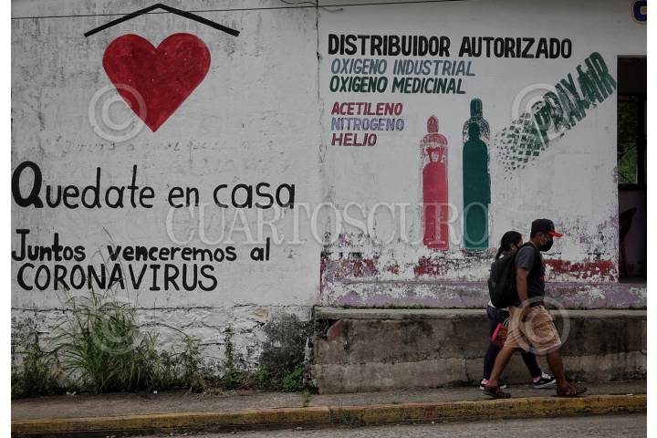 Una pareja camina por las calles de Matías Romero pasando frente a un mural referente a la crisis sanitaria creada por el nuevo Coronavirus