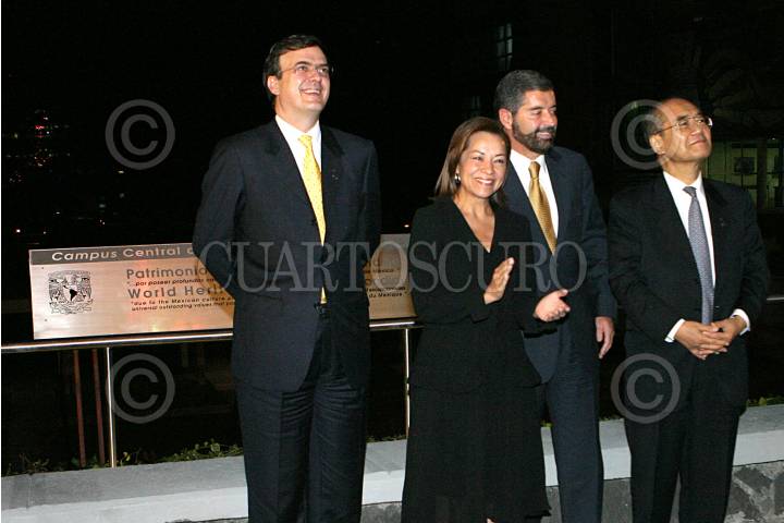 MÉXICO, D.F., 21SEPTIEMBRE2007.- Koichiro Matsuura, director general de la UNESCO entregó ésta tarde el pergamino oficial que reconoce a Ciudad Universitaria como Patrimonio Cultural de la Humanidad. En la imagen Josefina Vazquez Mota, Marcelo Ebrard, Juan Ramon de la Fuente y Koichiro Matsuura. FOTO: SAÚL LÓPEZ/CUARTOSCURO.COM