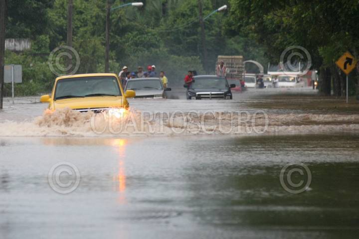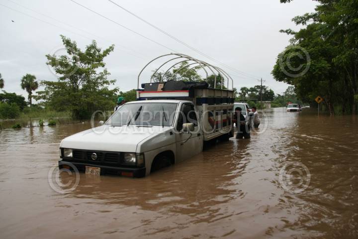 JALAPA, TABASCO, 27SEPTIEMBRE2010.- El paso de la tormenta tropical Matthew deja incomunicada la carretera federal Jalapa-Tacotalpa. En donde los habitantes de ambos municipios intentan ponerse a salvo utilizando vehículos de todo tipo de tamaño, pasando sobre la cinta asfaltica inundada hasta los dos metros de profundidad. FOTO: MARCO POLO GUZMÁN HERNÁNDEZ/CUARTOSCURO.COM